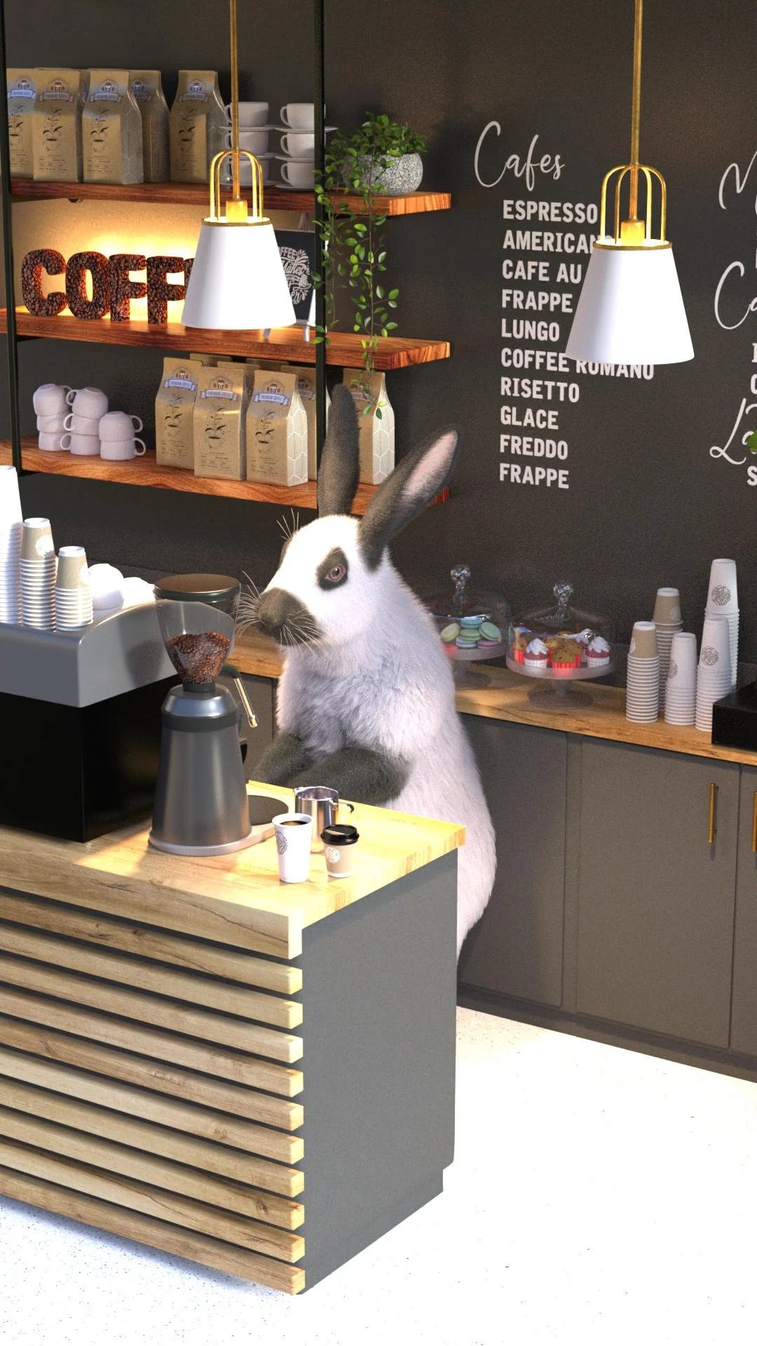 A café counter with a coffee grinder, cups, and coffee supplies, and a wall menu listing coffee drinks. A rabbit with black and white fur and large ears is standing behind the counter.
